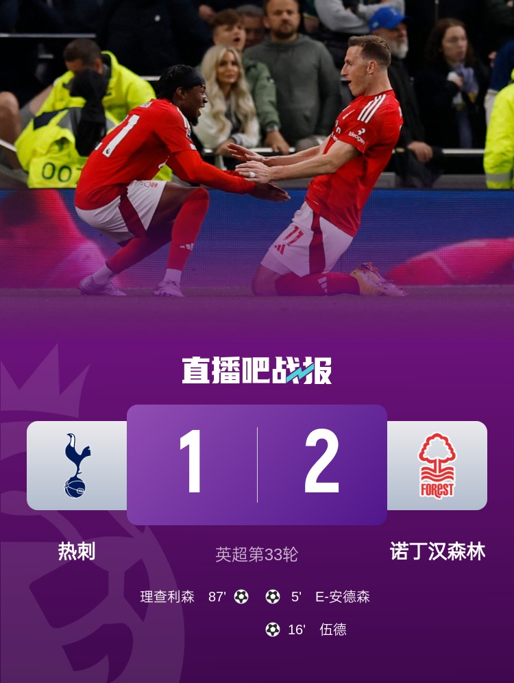 4月22日讯 北京时间3:00,英超第33轮热刺vs诺丁汉森林,比赛在新托特纳姆热刺球场打响!上半场,埃利奥特-安德森远射破门;伍德破门被吹后,又头球再进一球!下半场,理查利森屡失良机后打进1球!最终,热刺1-2不敌森林,赛季遭对手双杀!森林终结英超2连败,排名升至第3。